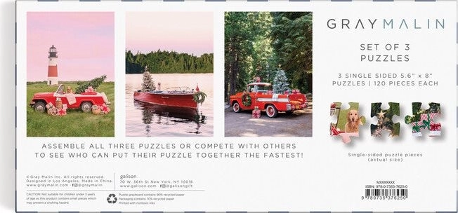 Gray Malin The Holiday 3-In-1 Puzzle Set obsahuje tři 120dílné puzzle inspirované bestsellery z leteckých snímků od Gray Malina. Ideální pro všechny, kdo se chtějí ponořit do světa umělecké fotografie a relaxace.