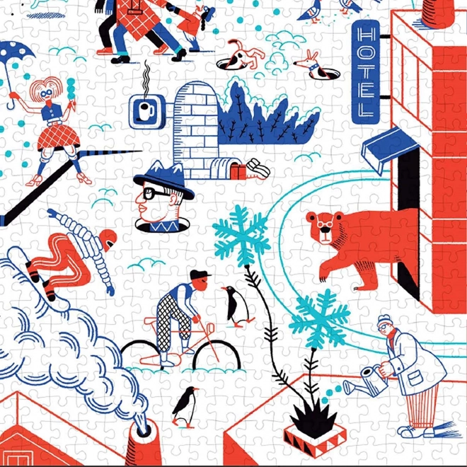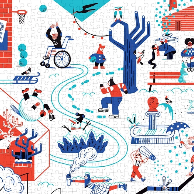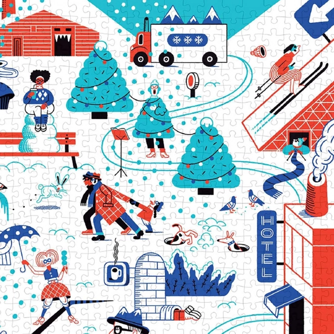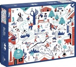 Puzzle nabízí veselý pohled na zimní svět plný aktivit jako lyžování a bruslení.