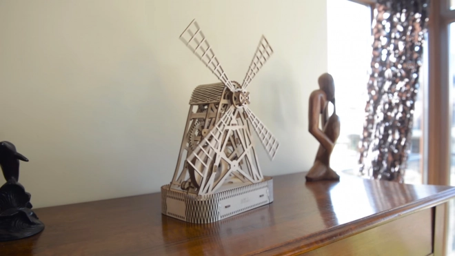 Po natažení se lopatky mlýna otáčí pomocí gumičkových převodů, což zajišťuje realistický pohyb.