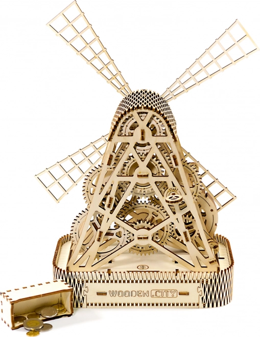 Po natažení gumovým pohonem se lopatky mlýna začnou otáčet, a díky setrvačníku mezi ozubenými koly si užijete zábavu až na jednu minutu na jedno natažení. Integrovaná schránka ve stojanu nabízí praktické využití jako pokladnička nebo úložný prostor pro drobnosti.
