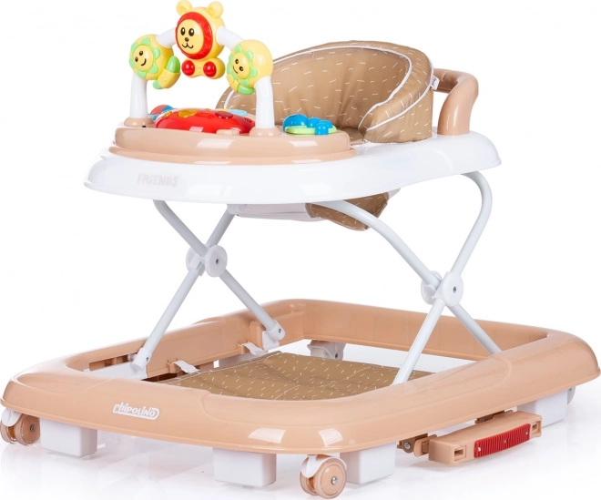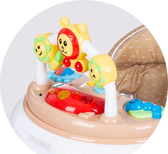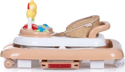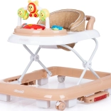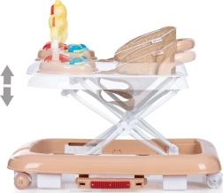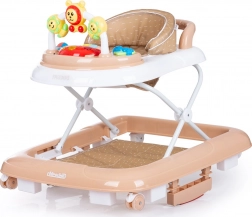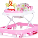 Interaktivní pultík s barevnými hračkami a hudebním panelem podporuje rozvoj smyslů a jemné motoriky. Sedátko lze nastavit do 3 výškových poloh, přední kolečka se otáčejí o 360° pro snadné manévrování a celé chodítko se jednoduše skládá i skladuje.