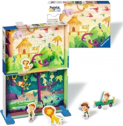 Sada Ravensburger Puzzle & Play: Dobrodružství v džungli přináší dvojnásobnou porci zábavy – nejprve skládání dvou pestrobarevných puzzle (každé o 24 dílcích) a poté hraní divadélka s přiloženými postavičkami. Spojením obou částí krabičky jednoduše vytvoříte stabilní scénu, do které se puzzle skládají jako pozadí.