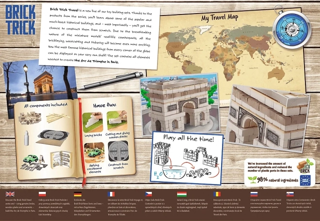 Trefně navržená stavebnice Brick Trick Travel vám umožňuje postavit si ikonický Vítězný oblouk, jeden z nejslavnějších symbolů Paříže, pomocí skutečných cihliček. Tím získáte nejen nádherný model, ale i možnost učit se novým dovednostem, jako je skládání a lepení. Vyjádřete svou kreativitu pomocí přiložených dekorací a papírových figurek.