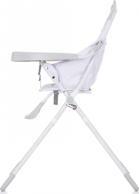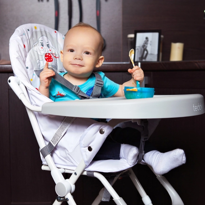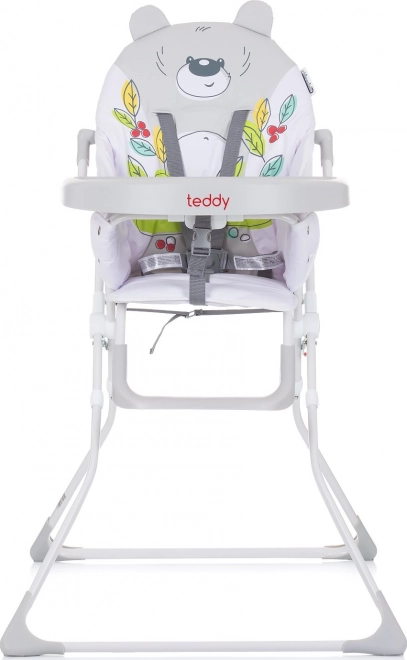 Skladná jídelní židlička Chipolino Teddy: široké sedadlo, 5bodové pásy, prostorný pultík a snadné čištění. Nosnost 15 kg, kompaktní po složení.