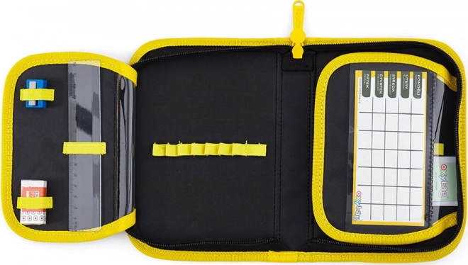 Jednopatrový penál s možností uchycení různých školních potřeb, vybavený průhlednou fólií pro plánovač hodin.