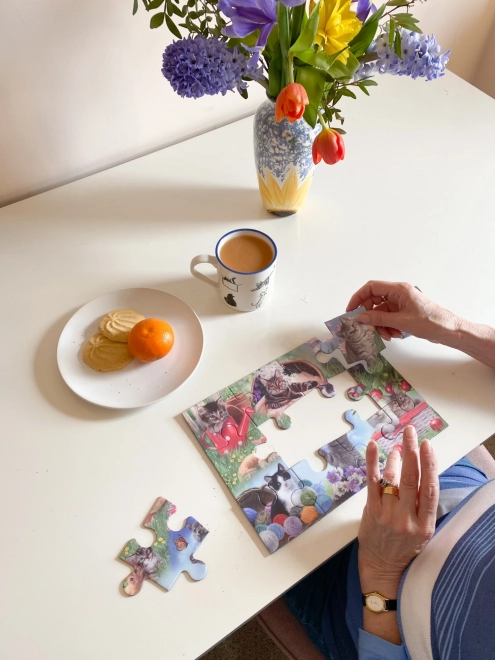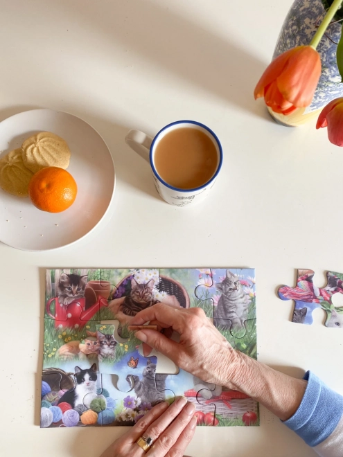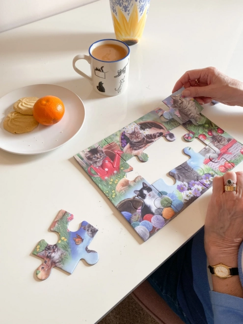 Příjemný motiv koček vytváří klidnou atmosféru a dodává skládání pozitivní emoce – hodí se pro společné i samostatné chvíle odpočinku.