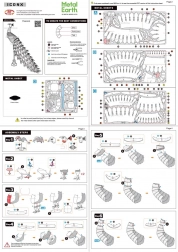 Sestavení probíhá z ocelových plátků (21 × 11 cm) pomocí chytrých zámků – bez lepidla. Stačí vyjmout dílky, zasunout je do připravených otvorů a zobáčky ohnout kleštěmi. Balení obsahuje 3 velké a 1 malý ocelový plátek a přehledný návod; doporučeny jsou malé kleště a štípací nůžky.