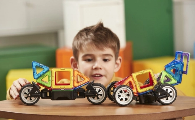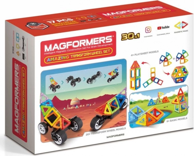 Součástí balení jsou dva typy podvozků – jeden se silnými koly s natáčením až o 90° pro jednostopá i dvoustopá vozidla a druhý s nastavitelnou výškou propojovací desky ve 3 polohách pro odvážné karoserie čtyřkolek a bugyn. Všechny dílky jsou bezpečné, odolné a splňují přísná zdravotní kritéria. Lze je kombinovat s ostatními sety MAGFORMERS pro ještě větší a pestřejší modely.