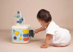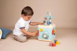 - Sorter tvarů, ozubená kolečka, otáčecí prvky, labyrint s korálky, dvířka a pohyblivé díly