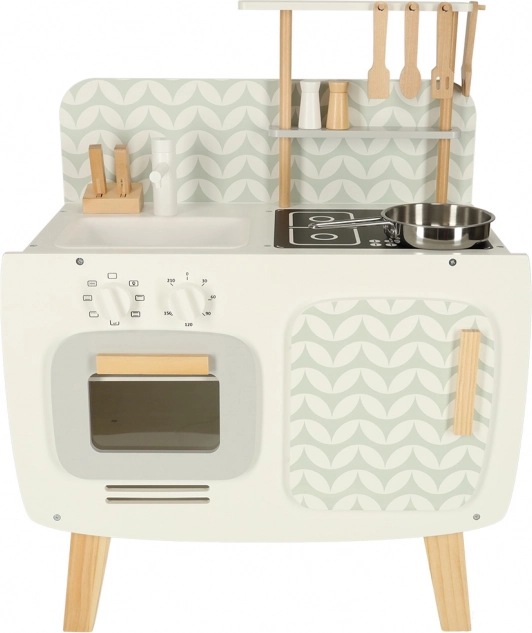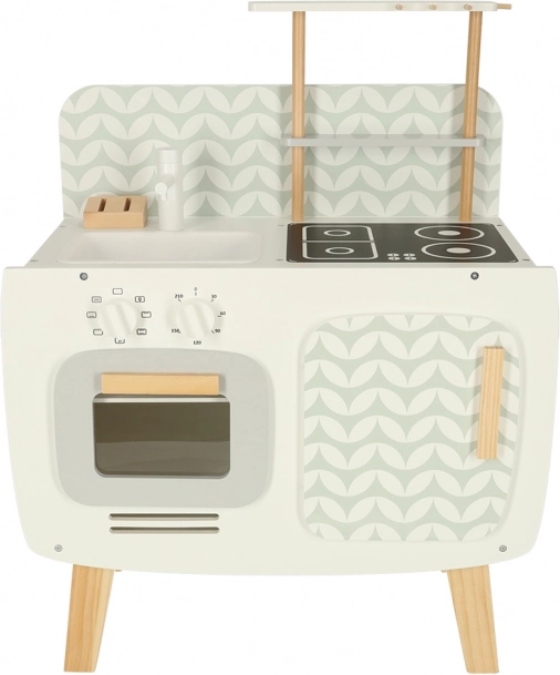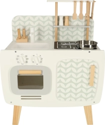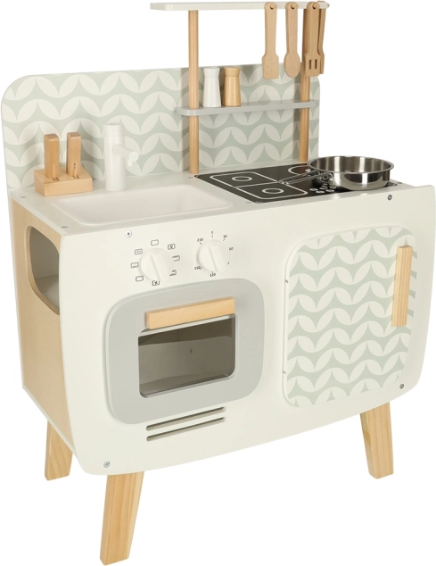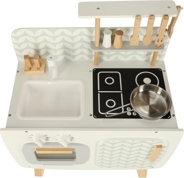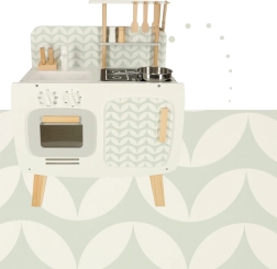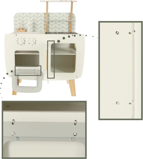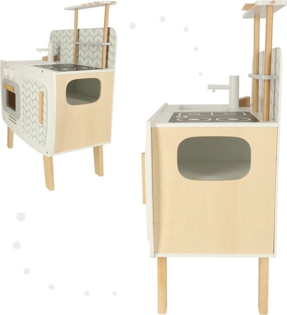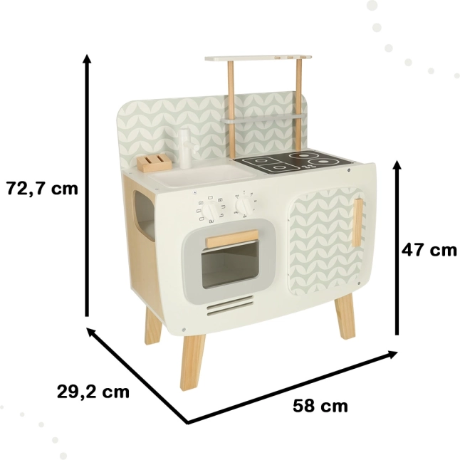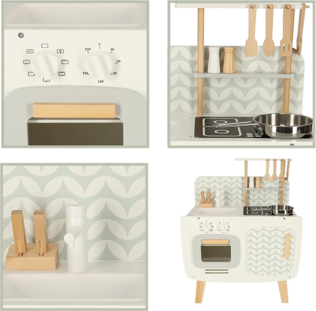 Kuchyně je vybavena základními spotřebiči, jako je trouba, sporák a dřez. Pohyblivé části jako otočné knoflíky dodávají hře na věrohodnosti, čímž podporují větší zapojení a zájem dětí o kulinářské činnosti.