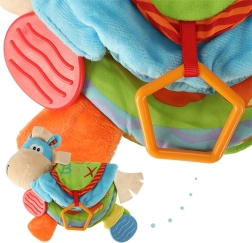 Knížka obsahuje barevné stránky s milými obrázky zvířátek a jemně šustící výplní, což podněcuje zvědavost a smyslové vnímání.