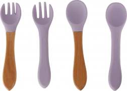 - Příjemné materiály: měkký silikon + dřevěné rukojeti příboru