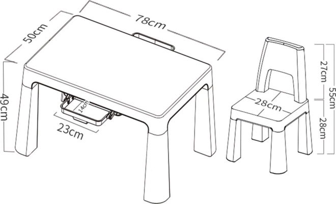 Plastový stolek s židlemi Neo nabízí odolný plast a moderní vzhled, který zapadne do každého dětského interiéru. Je vybaven dvěma praktickými šuplíčky o rozměrech 23 x 14 cm, kde si děti mohou uložit drobnosti.