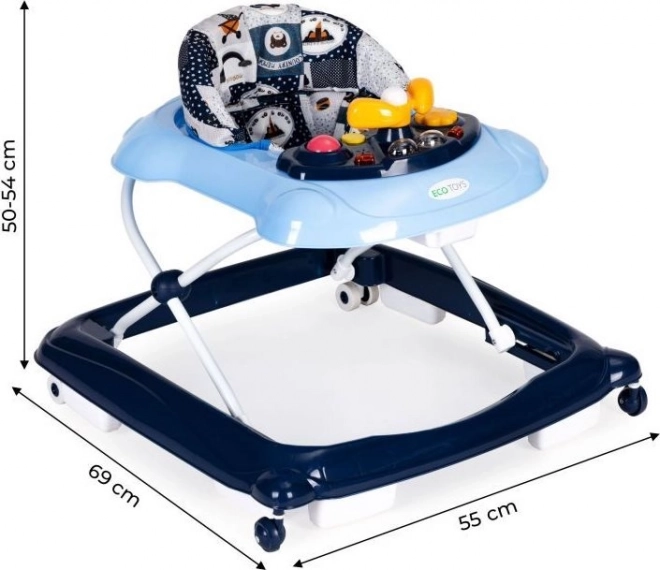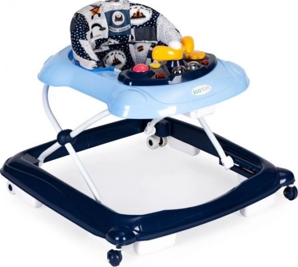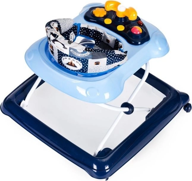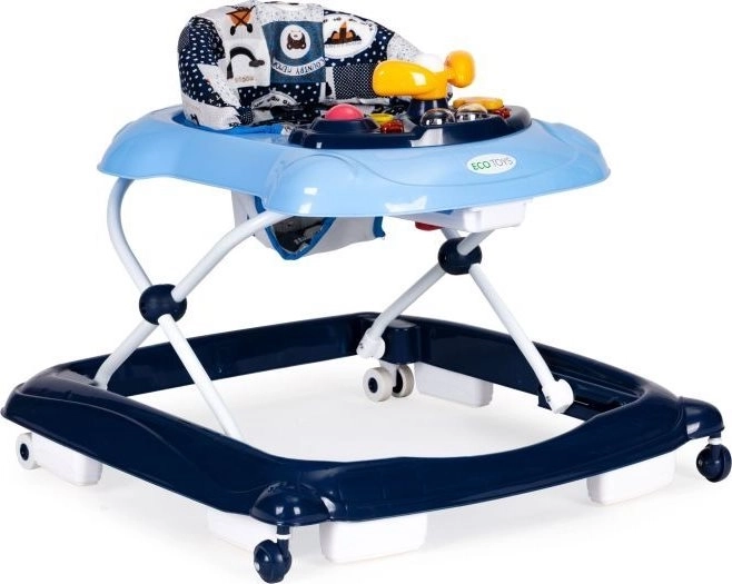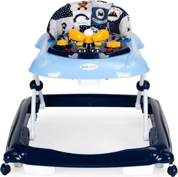 Dětské interaktivní chodítko s hracím pultíkem je určeno pro děti od 6 měsíců. Výšku chodítka lze na stavit dle výšky dítěte. Přední kolečka jsou otočná o 360°, zadní silikonová slouží zároveň jako zábrana jízdy pozpátku. Na spodní straně je umístěn stabilizační rám zabraňující převrácení. Kolečka jsou vyrobena z měkkého materiálu, který nepoškrábe podlahu. Potah sedátka lze sejmout a vyčistit. Výhody výrobku: - určeno pro děti od 6 měsíců - třístupňové nastavení výšky dle věku dítěte od 50 do 54 cm - tvarované sedátko zajišťující správné držení těla - měkka kolečka, která nepoškrábou podlahu - přední kolečka otočná o 360° - zadní kolečka blokují jízdu dozadu - stabilizační systém proti převrácení - zpevněné opěradlo sedátka Rozměry a technické údaje: - šířka 55 cm - nastavitelná výška konstrukce od 50 - 54 cm - délka 69 cm - maximální nosnost 12 kg