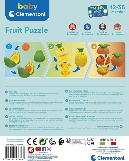 Objevte chytré a udržitelné hraní s CLEMENTONI BABY. Sada Skládací ovoce přináší tři roztomilé plody – avokádo, ananas a pomeranč – které děti motivují k objevování, třídění a skládání. Každý prvek je navržen tak, aby podporoval rozvoj logického myšlení, zrakově‑motorické koordinace a hmatového vnímání.