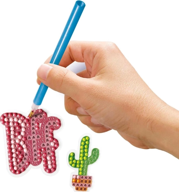 Postup: Vyberte samolepku s lepicím povrchem, vysypte diamanty do misky, do hrotu pera naberte vosk a kamínky nanášejte podle legendy či dle sebe.