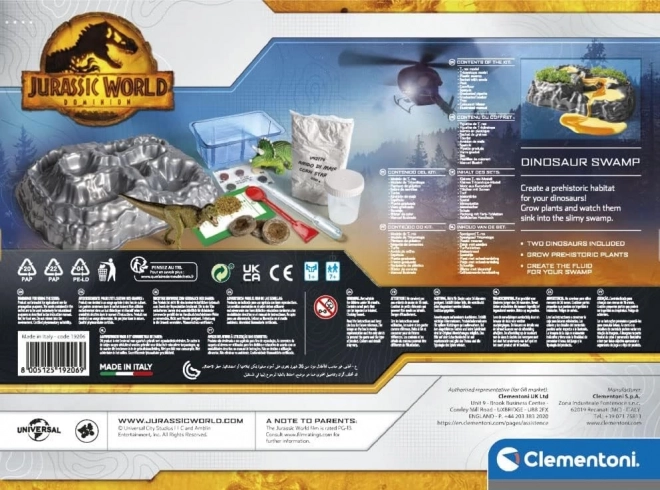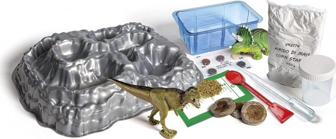 - 2 figurky dinosaurů (T-Rex, Triceratops), plastová bažina, semínka, rašelina, kukuřičný škrob, špachtle, odměrná pipeta, odměrná nádobka, tácek, barvivo, ilustrovaný návod v českém jazyce