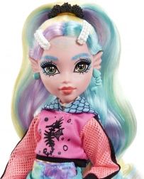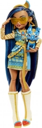 Panenka Cleo De Nile z kolekce Monster High zazáří v ikonickém outfitu inspirovaném starověkým Egyptem: modro‑zlaté šaty s rukávy připomínajícími obvazy, doplněné řetízkovým páskem a vysokými botami pod kolena. Celkový look podtrhují zlaté šperky a stylové sluneční brýle.