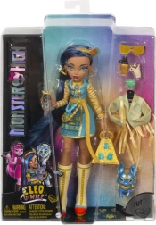 Součástí je také třásňová bunda a sada doplňků pro každodenní monstrózní story: pyramidový batůžek se skarabeem, „burrito“, nápoj, „smartphone“ a paletka líčení. Věrný mazlíček Tut inspiruje k hrám na přátelství až do hrobky. Díky artikulaci v trupu, loktech, zápěstích a kolenou je Cleo připravena na dynamické pózování i focení.