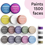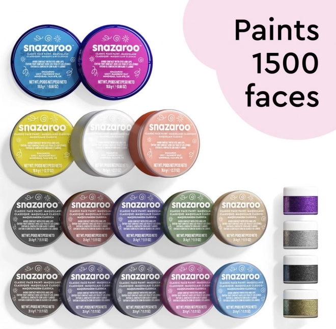 Profesionální sada pro malování na obličej a tělo SNAZAROO s bohatou výbavou pro školy, kroužky a velké akce. Nabízí dlouhotrvající, jasné a syté barvy, které jsou bezpečné a netoxické, vhodné i pro citlivou pokožku. Snadno se omyjí vodou a mýdlem a vystačí na minimálně 1500 obličejů.