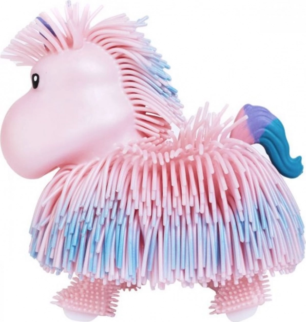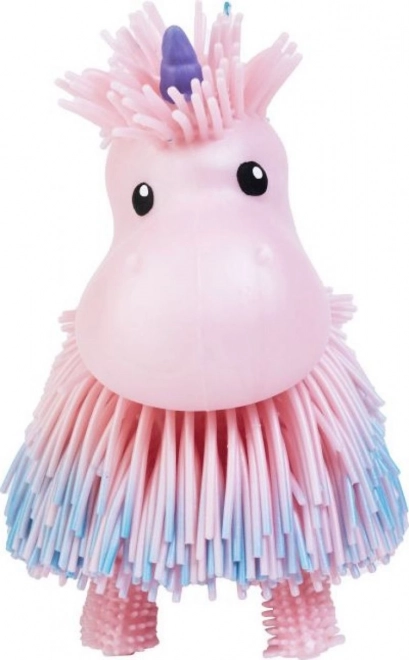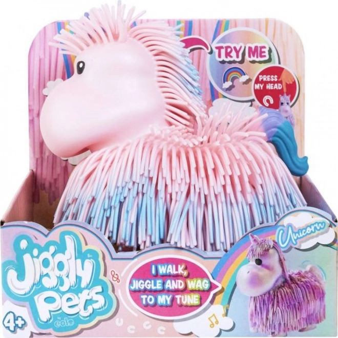 Roztomilý interaktivní jednorožec Jiggly Pets, který po stisknutí tlačítka na hlavě ožije: chodí, kývá hlavou, vrtí tělem i ocáskem a hraje veselé melodie. Měkký, třásňovitý povrch láká k dotyku a baterie jsou součástí balení (pro zkušební provoz).