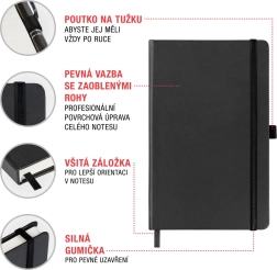Elastická gumička, poutko na tužku a vnitřní kapsa udrží vše pohromadě. Záložková stuha usnadní rychlou orientaci.