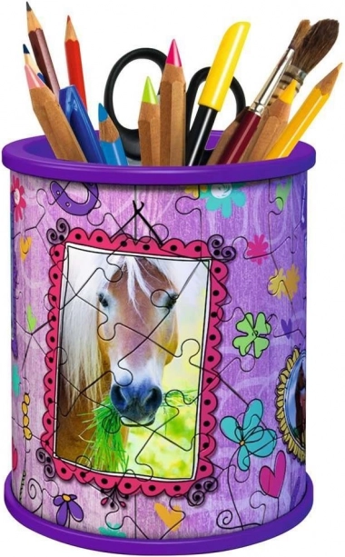 Objevte zábavné 3D puzzle, které se po složení promění v praktický stojánek na tužky, štětce či kosmetiku. Speciálně zakřivené a vysoce kvalitní plastové dílky RAVENSBURGER do sebe přesně zapadají a zaručí pevnou konstrukci bez potřeby lepidla. Motiv koně potěší všechny milovníky zvířat a dodá pracovnímu stolu osobitý styl.