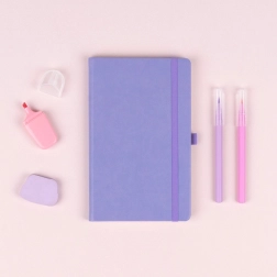 Elegantní zápisník ve velikosti 13 × 21 cm kombinuje odolnou pevnou vazbu a moderní lila design. Díky praktickému příslušenství – elastické pásce, poutku na tužku a textilní záložce – budete mít vše důležité vždy po ruce a své poznámky přehledně uspořádané.