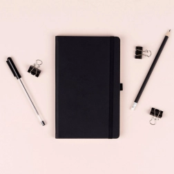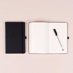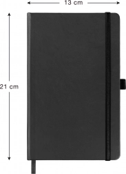Elegantní linkovaný notýsek v černé barvě s rozměry 13 × 21 cm nabízí pevnou knižní vazbu, elastickou gumičku, poutko na tužku a textilní záložku. Kvalitní žlutý papír s 6mm linkami je ideální pro každodenní psaní, plánování i poznámky. Povrch s hrubší strukturou umožňuje ražbu loga, díky čemuž je notes skvělý i jako firemní dárek.