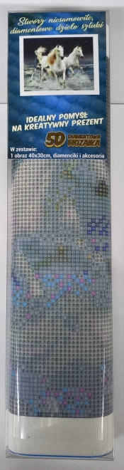 Diamantové malování je snadná a zábavná tvořivá aktivita, při které pomocí aplikačního pera lepíte drobné kamínky na předtištěné plátno. Motiv cválajících běloušů vynikne třpytivým efektem a stane se ozdobou každého interiéru. K práci nepotřebujete žádné umělecké dovednosti – stačí postupovat podle legendy.