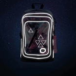 Pevný voděodolný materiál, reflexní prvky pro viditelnost, elastické boční kapsy na láhev a vyztužená tajná kapsa na dně batohu pro cennosti.