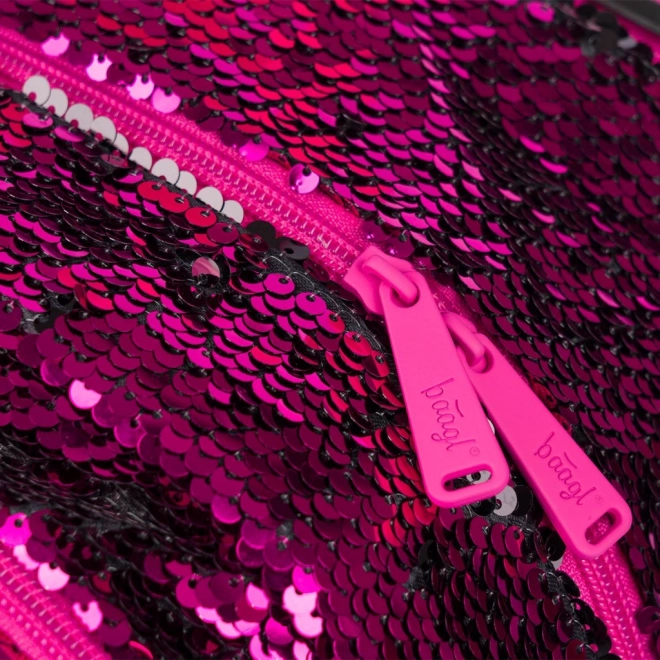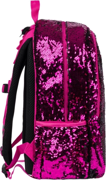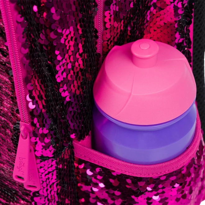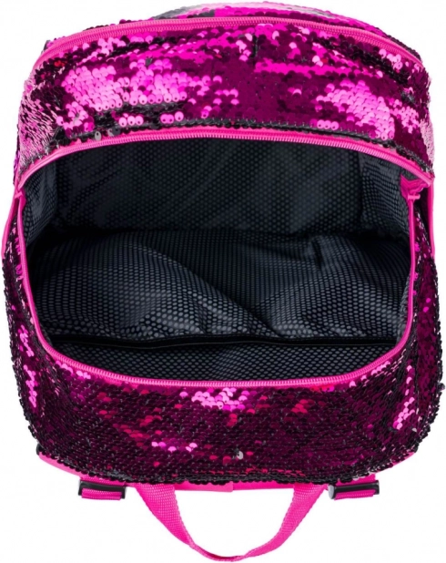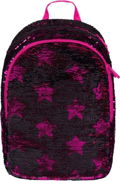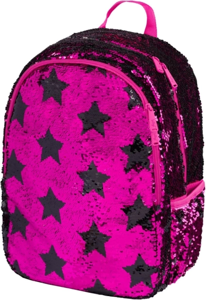 Růžové flitry a černé hvězdné vzory dodávají batohu výrazný styl, ideální pro děti, které chtějí vyčnívat z davu.