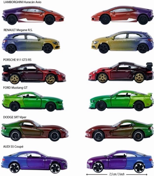 Vyberte si z modelů PORSCHE 911 GT3 RS, LAMBORGHINI HURACÁN, AUDI S5 COUPÉ, FORD MUSTANG GT, DODGE SRT VIPER a RENAULT MEGANE R.S. – každý v atraktivních odstínech a s efektem Color Changers.