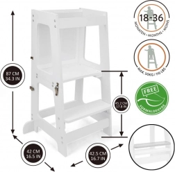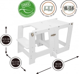 Učící věž 3v1 bílá nabízí všestrannost díky třem různým konfiguracím: věž, stůl a židle. Vyrobená z vysoce kvalitního a odolného překližkového materiálu, je snadno sestavitelná a má maximální nosnost až 50 kg.