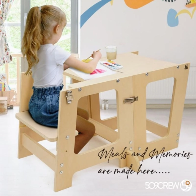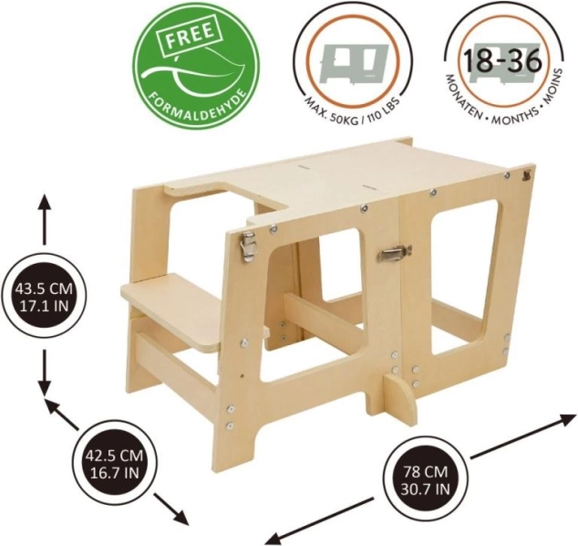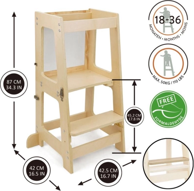 Prema 3v1 učící věž je vyrobena z vysoce kvalitní a odolné překližky, která nabízí snadné sestavení a dlouhou životnost. Disponuje 2 úrovněmi výšky (16,5 cm a 22,5 cm), aby se snadno přizpůsobila růstu vašeho dítěte.