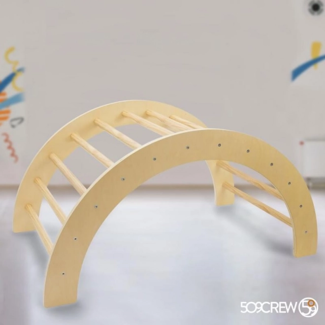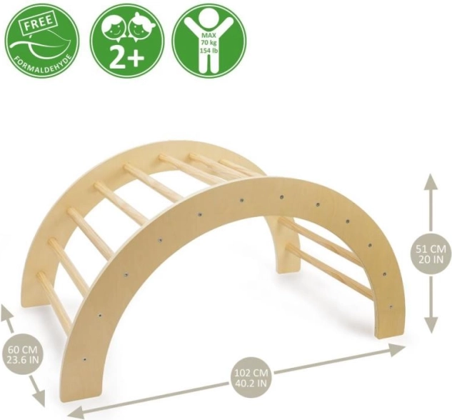 Oblouk je vyroben z kvalitní přírodní překližky, která je zcela bez formaldehydu, což zajišťuje bezpečnost pro děti. Jeho maximální nosnost je 70 kg, což umožňuje bezpečné používání. Montáž je snadná a rychlá – zvládnete ji pomocí jednoho přiloženého imbusového klíče. Produkt zahrnuje také srozumitelný návod k použití. Ideální pro děti od 24 měsíců.