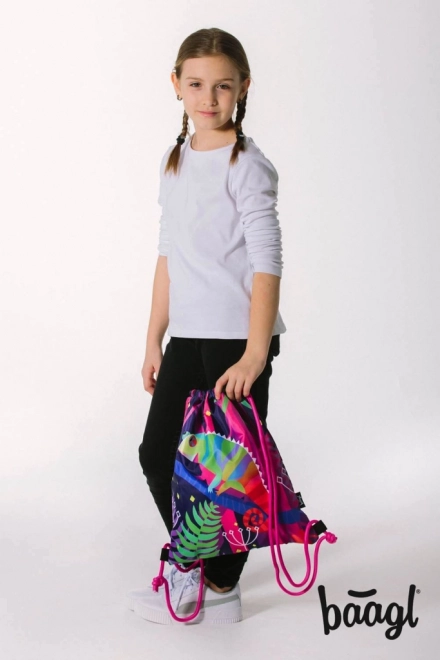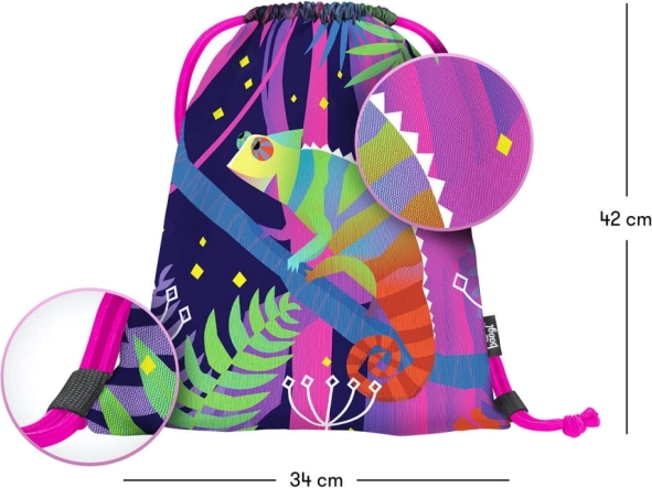 Praktický sáček BAAGL s motivem chameleona je ideální na obuv i drobnosti pro volný čas. Vyroben z pevného omyvatelného materiálu a vybaven stahováním pomocí pevných tkanic, které zároveň umožňují pohodlné nošení na zádech.