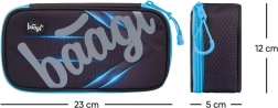 Pevný penál s výklopnou přepážkou a kapsou na zip (bez náplně) udrží psací potřeby v pořádku. Sáček z omyvatelného materiálu lze nosit na zádech a jeho logo BAAGL ve tmě svítí.