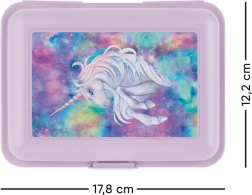 Objevte kouzelný box na svačinu v fialové barvě s oblíbeným unicornem na víku. Praktický a bezpečný pro děti na cesty.