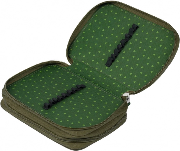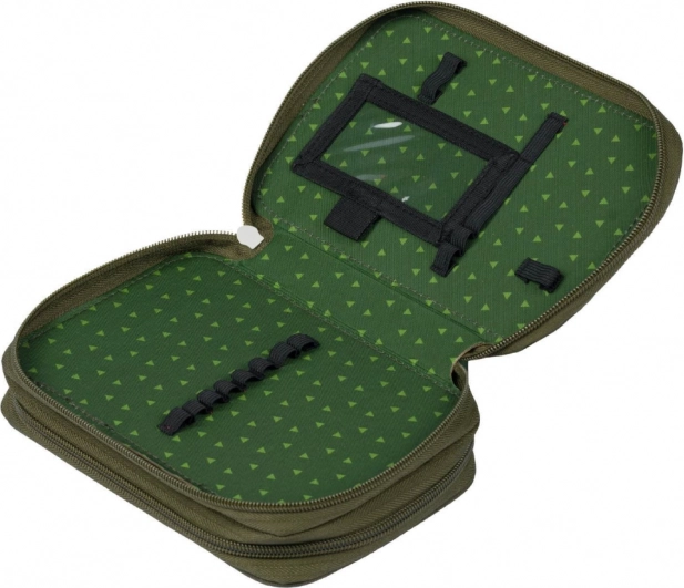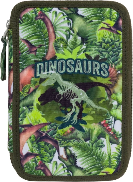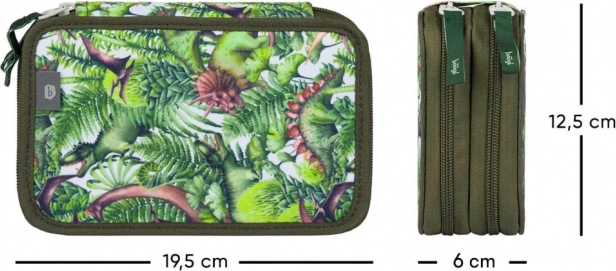 Tento penál nabízí unikátní dinosaurí motiv s výraznými zelenými a hnědými vzory listů.