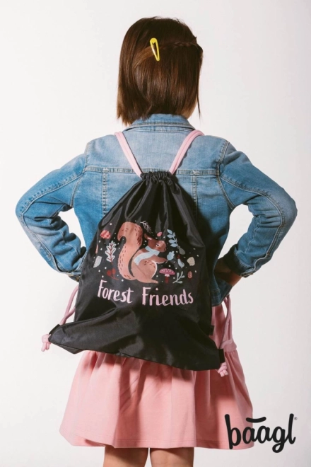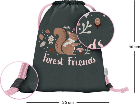 Sáček zdobí motiv veverky a nápis 'Forest Friends', což ho činí ideálním pro milovníky přírody.