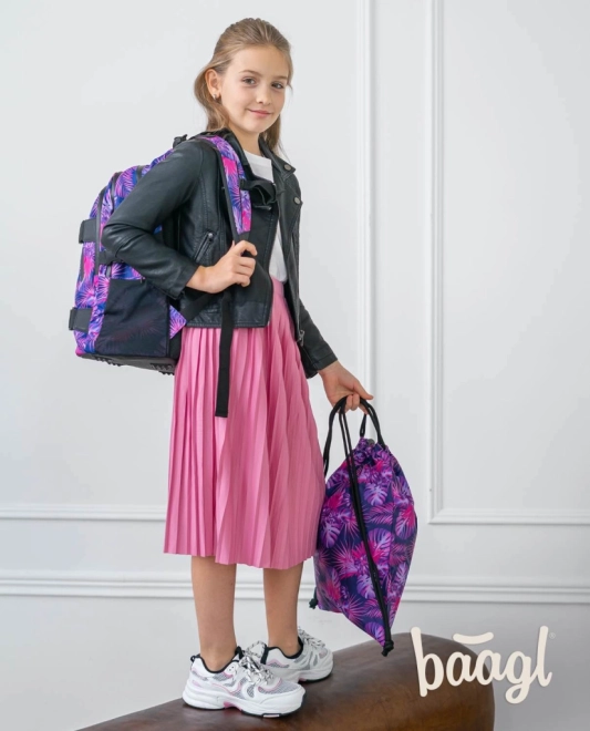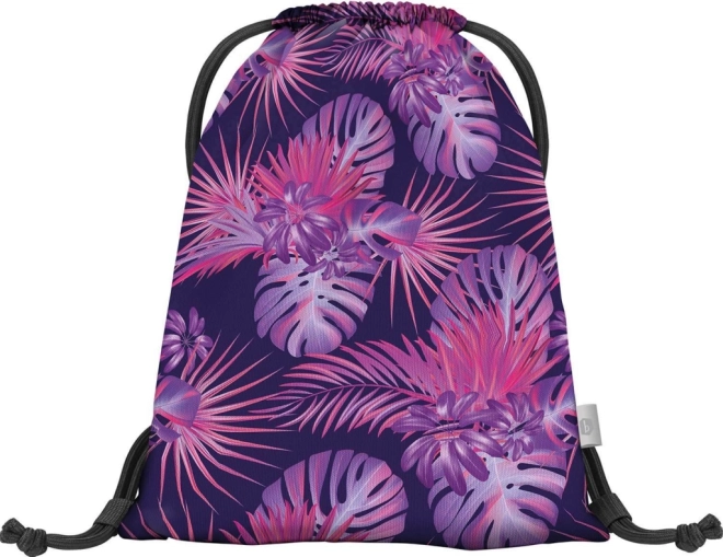 Sáček má atraktivní tropický motiv v růžových a fialových tónech, který upoutá pozornost.