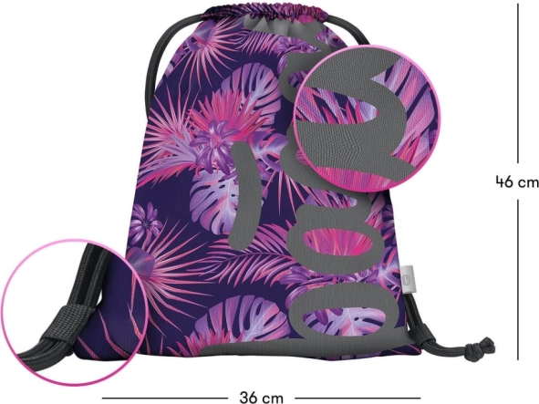 Náš sáček na cvičky s tropickým motivem je dokonalým doplňkem pro ty, kteří hledají jak praktičnost, tak styl. Je vyroben z pevného a omyvatelného materiálu, což zajišťuje dlouhou životnost.