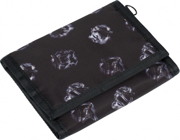 Černý vzor s motivy Bradavic dodává peněžence unikátní vzhled.