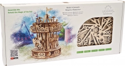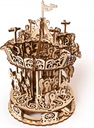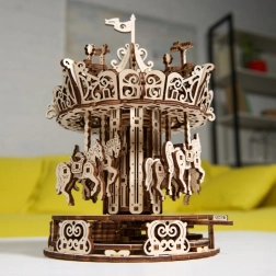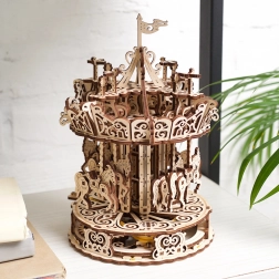 Udělejte si radost elegantním kolotočem z kvalitní překližky, který spojuje nostalgii s chytrou mechanikou. Díky gumovému natahovacímu pohonu se středový sloup a stříška točí opačným směrem, čímž vytváří optickou iluzi vysoké rychlosti. Koníci plynule stoupají a klesají a nad kolotočem krouží drobní ptáčci – to vše je krásně vidět díky otevřenému designu.