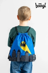 Modrý sáček zdobí ikonické logo Batmana a jedinečný městský motiv.