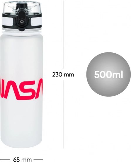 - Bílá láhev, víčko černá/bílá, červené logo NASA