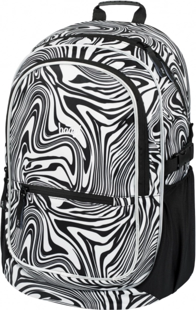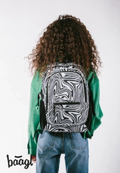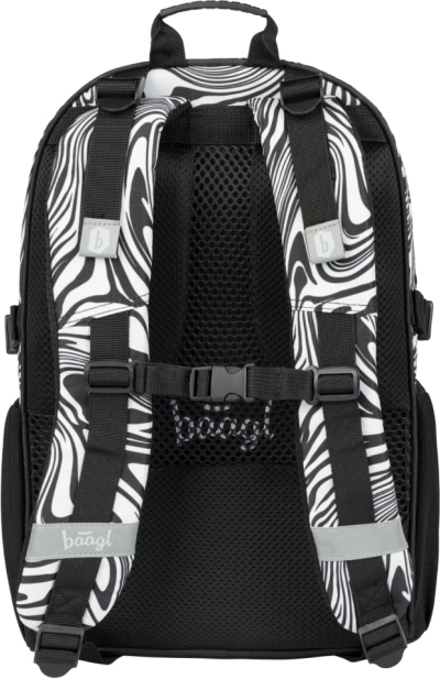 - Design a funkčnost: moderní černobílý swirl vzor, přívěsek BAAGL, promyšlené kapsy a zipy pro rychlou organizaci.