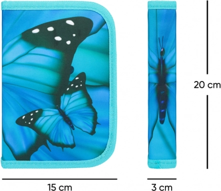 Elegantní penál v tyrkysově modré barvě s výrazným motivem motýla kombinuje styl a funkčnost. Díky dvěma vnitřním chlopním, gumovým úchytům a kapsám budete mít psací potřeby i drobné školní pomůcky vždy přehledně uložené a bezpečně uzavřené na zip.