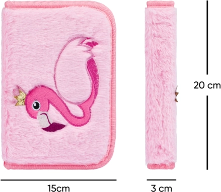 Přední stranu zdobí výšivka plameňáka s korunkou na měkkém plyšovém povrchu, který je příjemný na dotek a dělá z penálu originální doplněk.